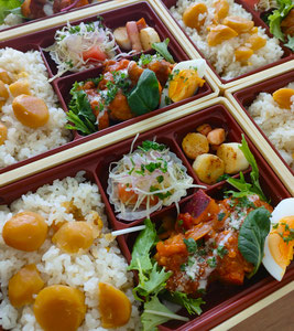 ごろっと大きな栗が入った栗ご飯と、秋野菜と肉団子のトマトソース煮込みを詰め込んだお弁当です。秋限定の栗ご飯をぜひ!