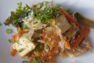 厚揚げ、野菜、豚肉を炒め、たまごでとじたチャンプルーです。たっぷりのかつおぶしをトッピングしました。