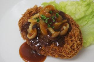 ボリューム満点のメンチカツにきのこのデミグラスソースをかけました。