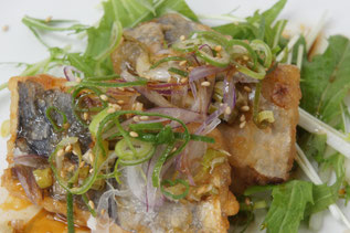 さごしを竜田揚げにし、ねぎやみょうがが入った香味だれをかけました。