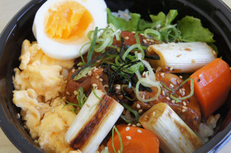 ねぎと鶏肉をこってりの照り焼きだれで焼き、ご飯の上にのせたDONBURIです。あまいふんわりたまごとともにどうぞ。